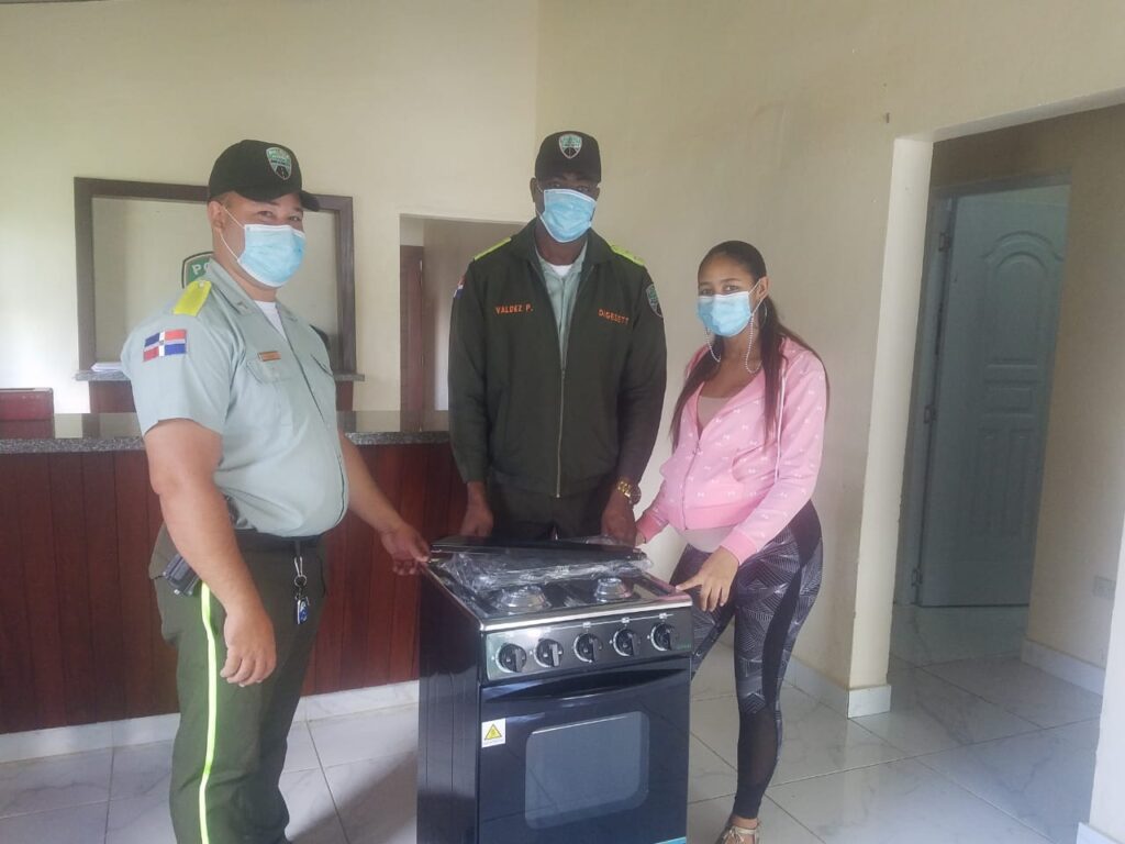 Pie de foto: El Consejo de apoyo a Jarabacoa Inc, Entrego a la DIGESETT de esta localidad una moderna estufa , para la cocción de sus alimentos, Marifer Duran entrego por Coaja ,mientras que por la DiGESETT Recibe el comandante Valdez junto a uno de sus alistados.